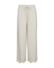 Broek van freequent in een zacht materiaal. De broek heeft een eenvoudig silhouet met een elastische tailleband met trekkoord, zijzakken en enkellengte, brede broekpoten met borduurwerkonderaan aan de onderkant. Een detail dat een vrouwelijke aanraking toevoegt.